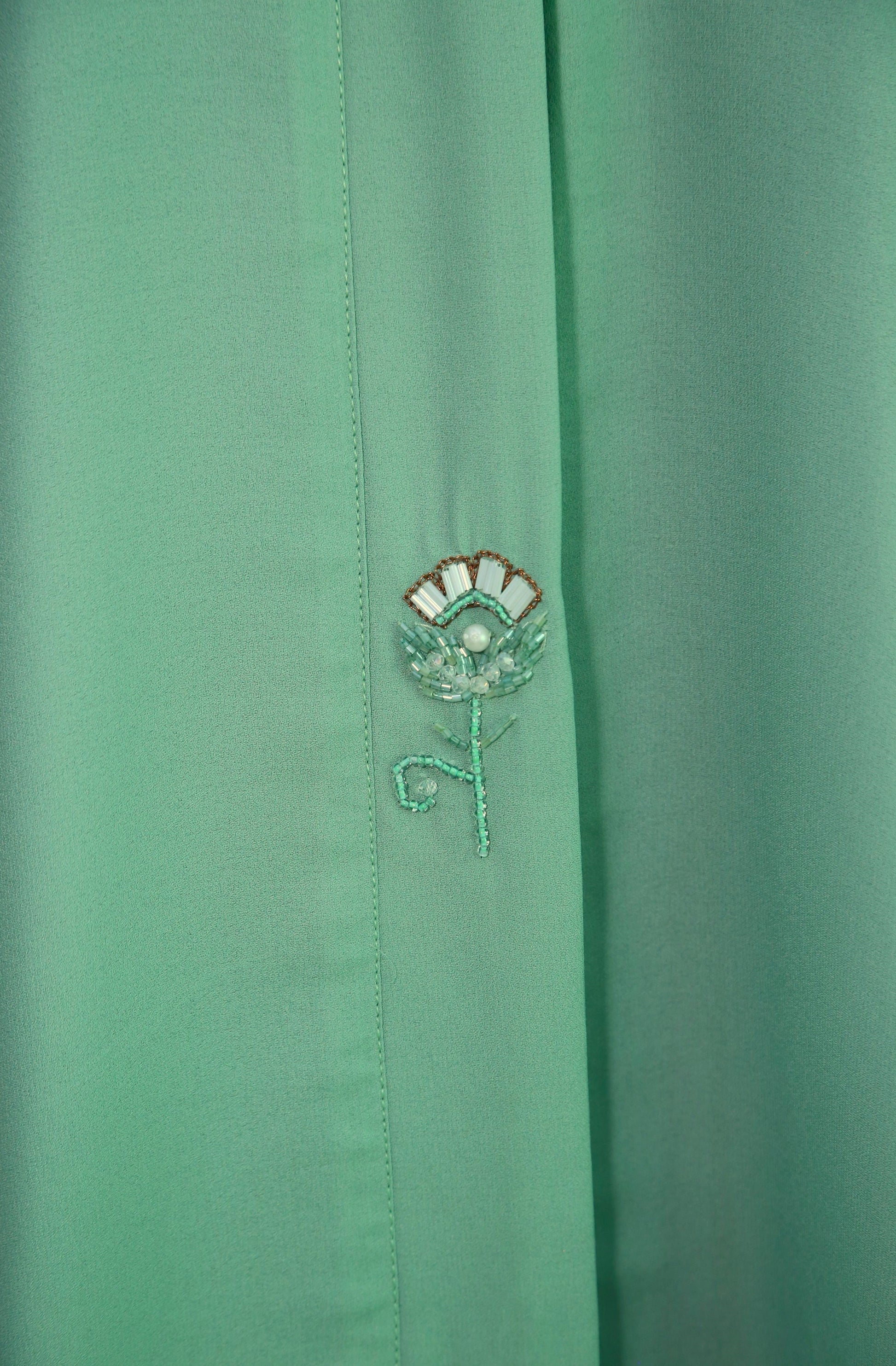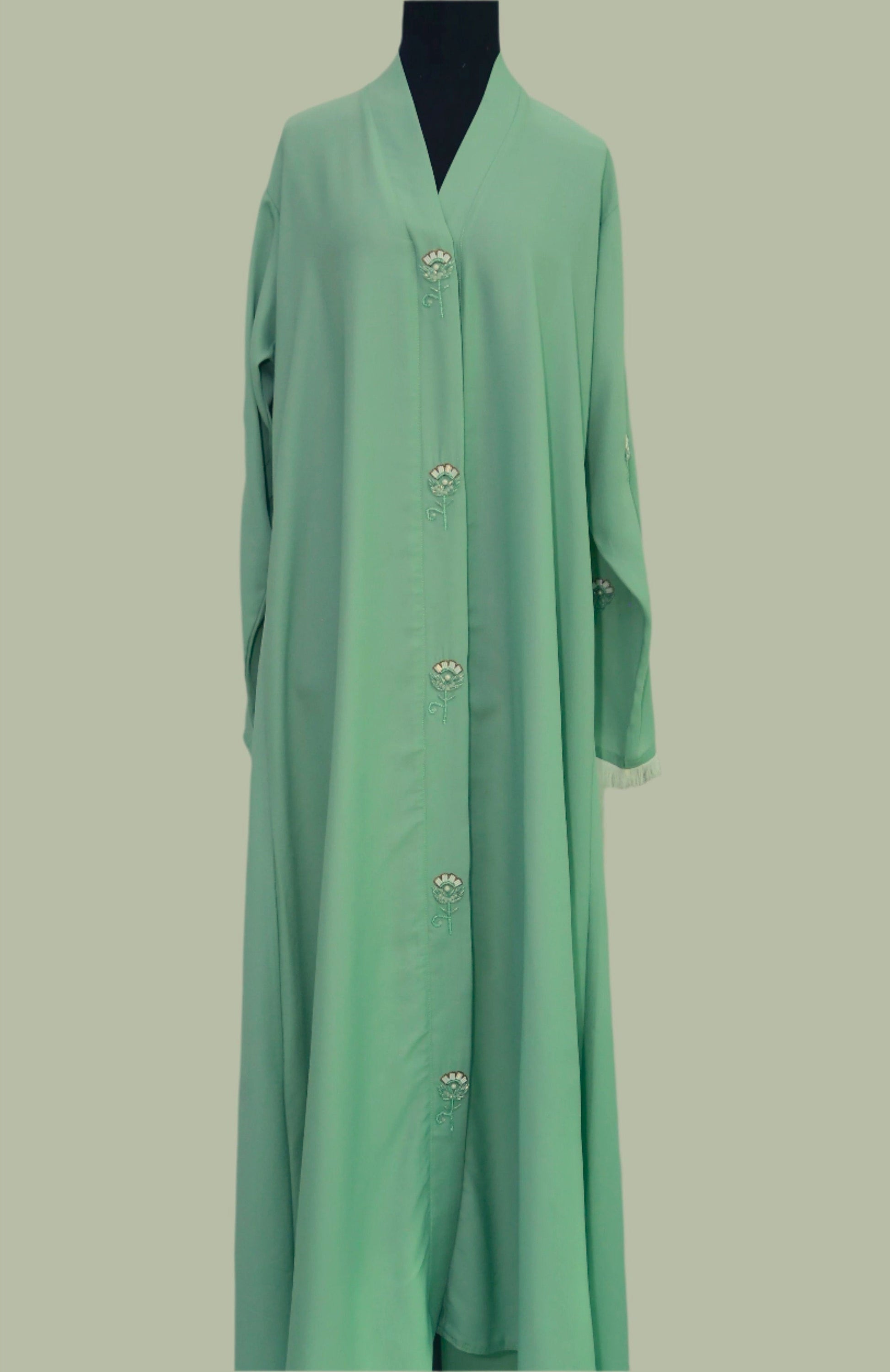 Elegant mint and white formal abaya with beautiful detailing on sleeves, front and hijab. Made from premium Arabic fabric, perfect for your special occasions. We're confident you'll look stunning in this quality piece!